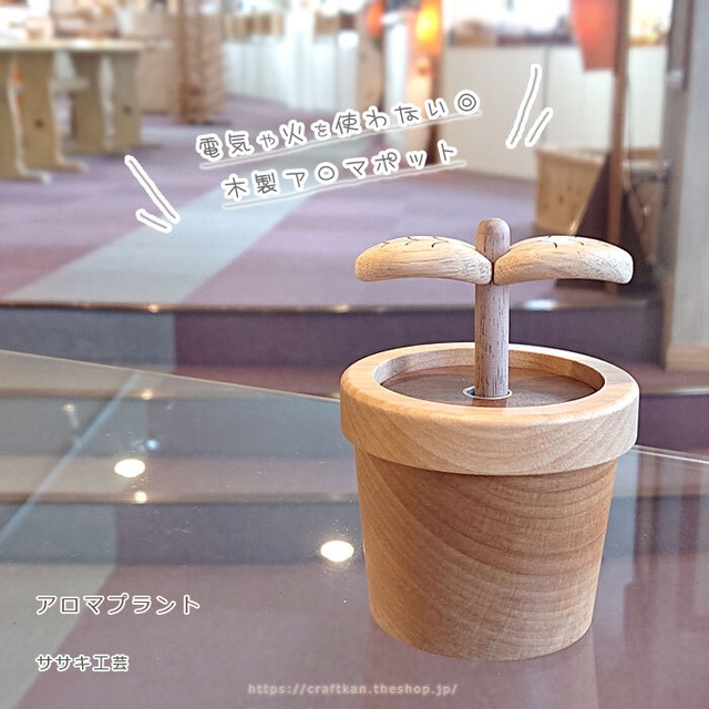 アロマプラント/ササキ工芸 オイルなど、お気に入りの香りが木の双葉からふんわり優しく香って癒される、手の平サイズのおしゃれでかわいい、電気・キャンドル不使用、水なしのリード式、木製アロマディフューザー ------------------------------------------------------------------------------------------- インテリアとしてちょっとした所に飾っても可愛い 手の平サイズの小さな鉢植えデザインのアロマディフューザーです。 火や、電気も使わないので、好きな場所に気軽に飾れます♪ 使い方も、中の小瓶に別途ご用意して頂いたお好きなアロマオイルを入れるだけ、ととっても簡単! お気に入りの香りが、木のぬくもりあふれる優しい小鉢から香ってくると よりいっそうホッと癒しの一時を過ごせそうですね。 デスクやちょっとした棚に、お気に入りの香りを木のぬくもりとともにちょこん、と置きませんか? ご自宅用のほか、贈り物にも人気ですよ♪ ▽アロマプラントを動画でもご覧頂けます♪ https://www.youtube.com/watch?v=KQloBLYTats - - - - - - - - - - - - - - - - - - - ○製造:ササキ工芸(北海道旭川市) ○商品サイズ:約71×71×97mm ○材質:ウォルナット、カバ ○塗装:本体→ウレタン塗装仕上げ / 双葉→無塗装 ○備考 ・なるべく忠実に表現するよう努めておりますが、お使いのディスプレー等により、色が多少異なって見える場合がございます。 ・木は自然のものですので、同じ材料から作られた同じ製品でも、一つ一つ微妙に木目や色味が異なります。 お写真と全く同じ商品をご用意させて頂く事はできませんので、予めご了承下さいますようお願い致します。 - - - - - - - - - - - - - - - - - - - 木製品のお取り扱いに関して ・製品になってからも、木は呼吸を続けます。 空気中の湿気を吸い込んだり、乾燥していれば湿気を放出したりします。 そのため、湿気や、日光などの影響で膨らんだり、縮んだりする事があり、収縮を繰り返して反り返ってしまうような場合がございます。 また、強い日差しに晒されると乾燥して湿気が無くなり、急な変化に対応出来ない場合には割れが生じてしまう事があります。 もちろん、日光に当たればその分日焼けもしますので、エアコンの風が直接当たる所や、ストーブ等が近すぎる所などの乾燥の激しい場所、直射日光の当たる場所は極力避けてお使い下さい。 ・お手入れの仕方。 ホコリ程度でしたら、乾いた布で拭き取る事をお勧めします。 汚れが気になる場合には、水にぬらしてからしっかりと絞った布で水拭きをして下さい。 水分を含み、上記のような膨張などが起こってしまう場合が御座いますので、お掃除の際にも水分に長時間浸さないようお願い致します。 ・色が変化していきます。 使う事により、経年色が変化していき、使い込んだ物ならではの、さらに深い味わいのあるものへと変化していきます。 愛用して頂き、是非その新品には出せない味をご堪能下さい。 - - - - - - - - - - - - - - - - - - - ○熨斗、ギフト用ラッピング無料です* オプションよりご選択、または備考欄等にてお知らせ下さい。 ○最短のお届け日は目安です。 お届け先の地域や、お支払方法等によって前後する場合がございます。 お急ぎの際はお気軽にご相談下さいませ。 - - - - - - - - - - - - - - - - - - - ▽ササキ工芸 さんの作品一覧ページ https://craftkan.theshop.jp/categories/1931443 ▽木、葉っぱ、植物モチーフ一覧ページ https://craftkan.theshop.jp/categories/3712570 - - - - - - - - - - - - - - - - - - -