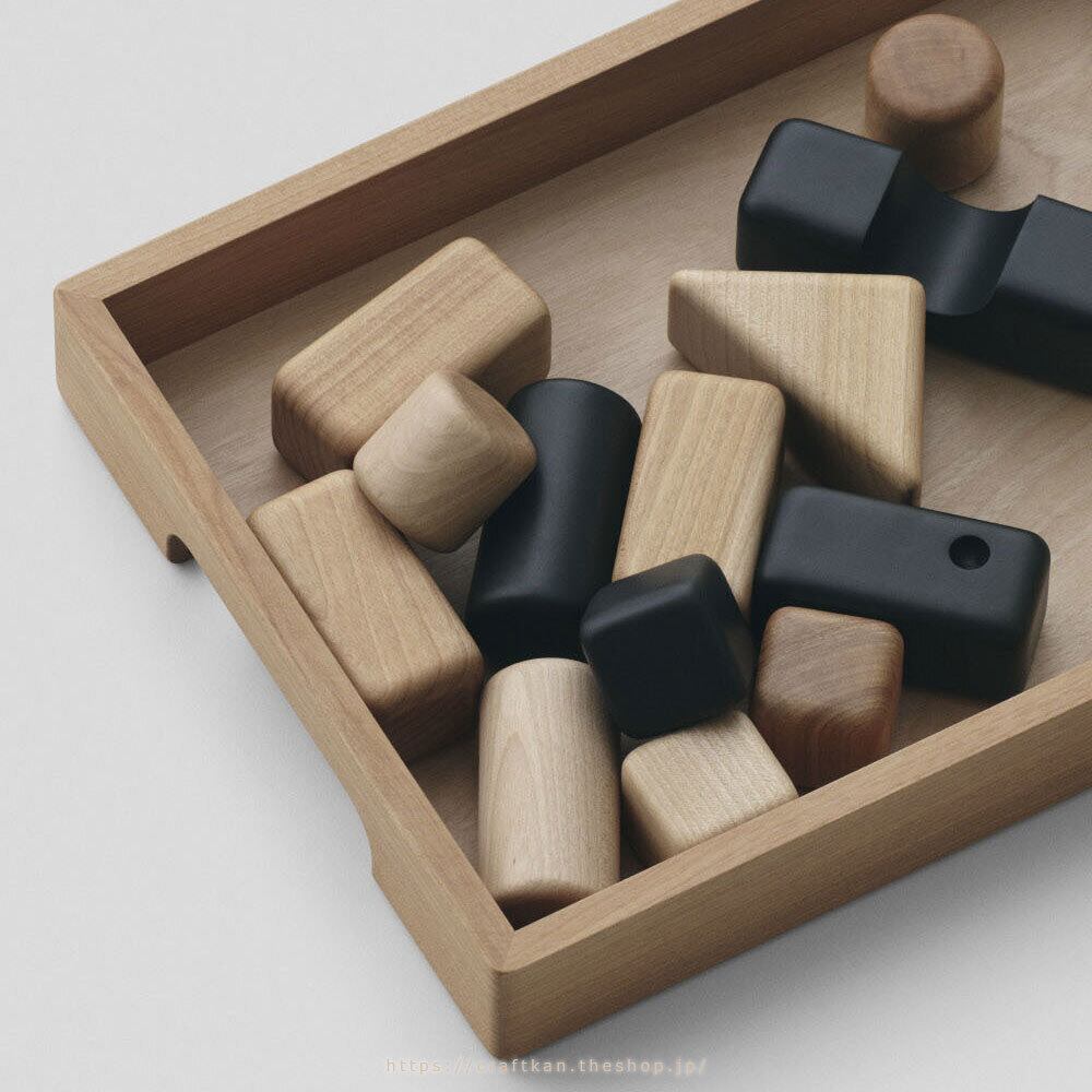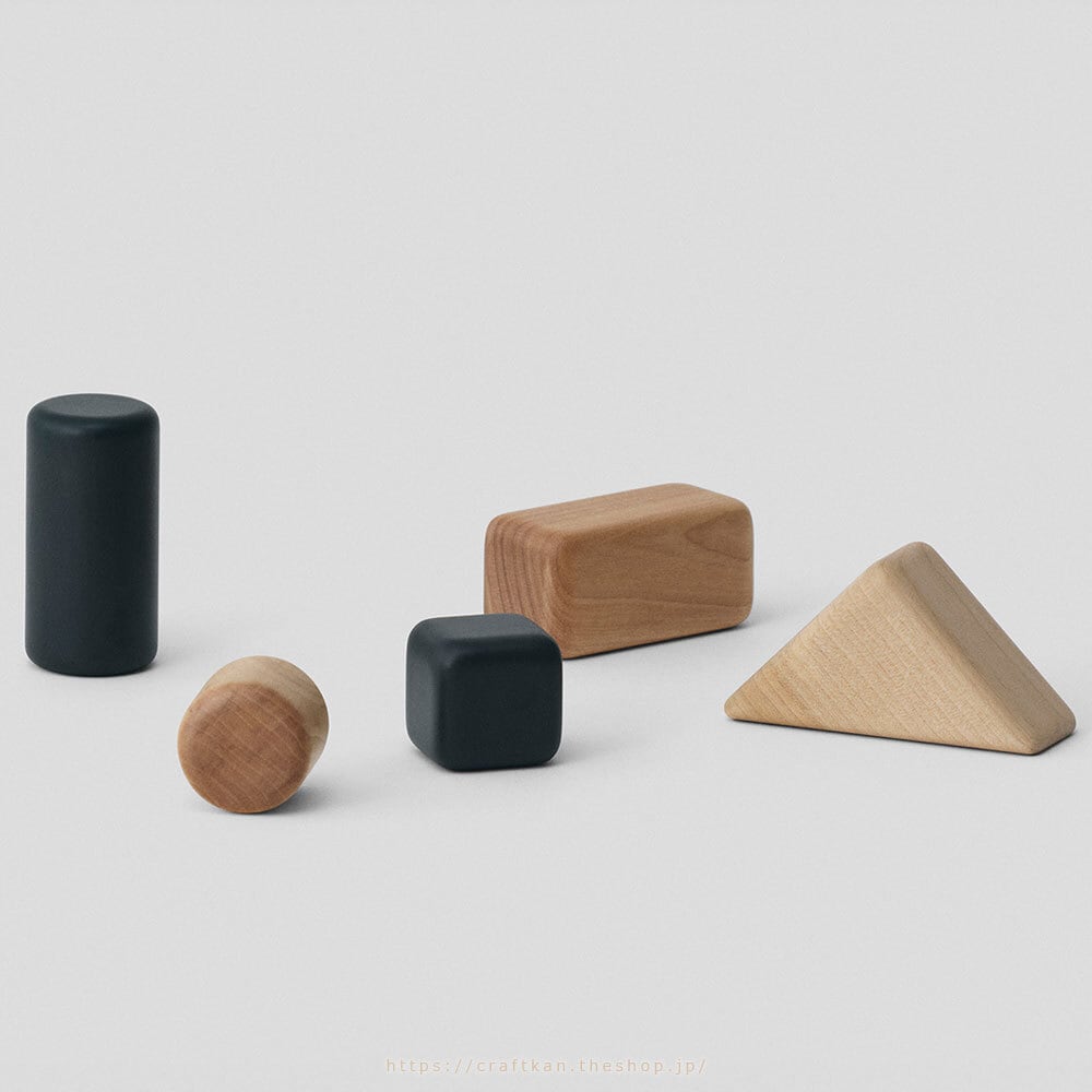1つ1つ、丁寧につくられた、正方形、長四角、三角、円柱、と様々な形のピースの