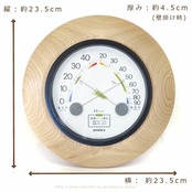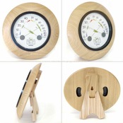 足は寝かせて壁掛けタイプとしても使える、室内用の木製温湿度計です。