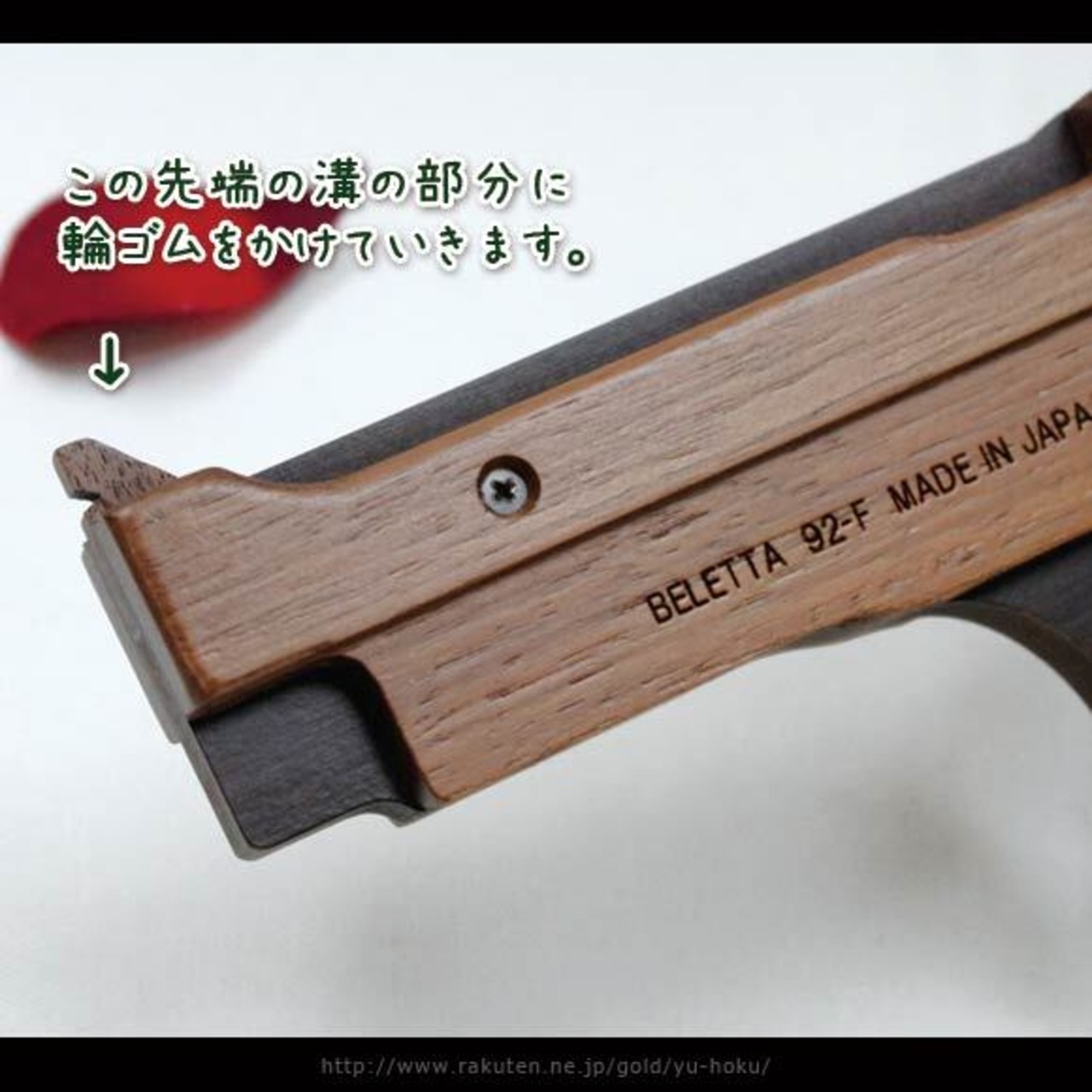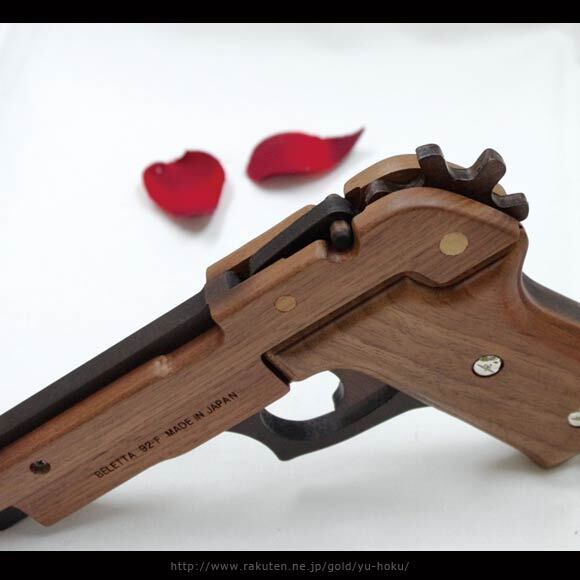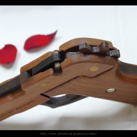 輪ゴムを1つずつ、全部で5発装填し、連射可能な本格派の木製ゴム鉄砲です。