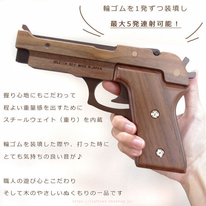 輪ゴムを1つずつ、全部で5発装填し、連射可能な本格派の木製ゴム鉄砲です。