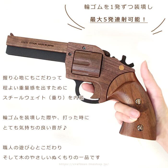輪ゴムを1つずつ、全部で5発装填し、連射可能な本格派の木製ゴム鉄砲です。