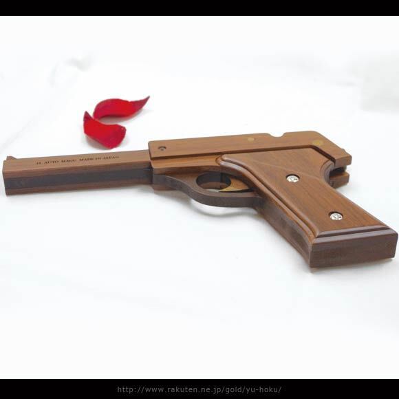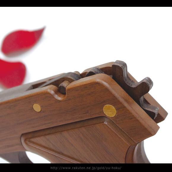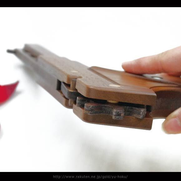 輪ゴムを1つずつ、全部で5発装填し、連射可能な本格派の木製ゴム鉄砲です。