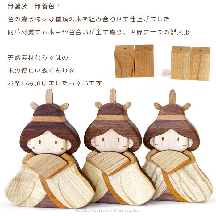 木が持つ天然の色をいかして組み合わせて仕上げた卓上サイズの木製雛人形