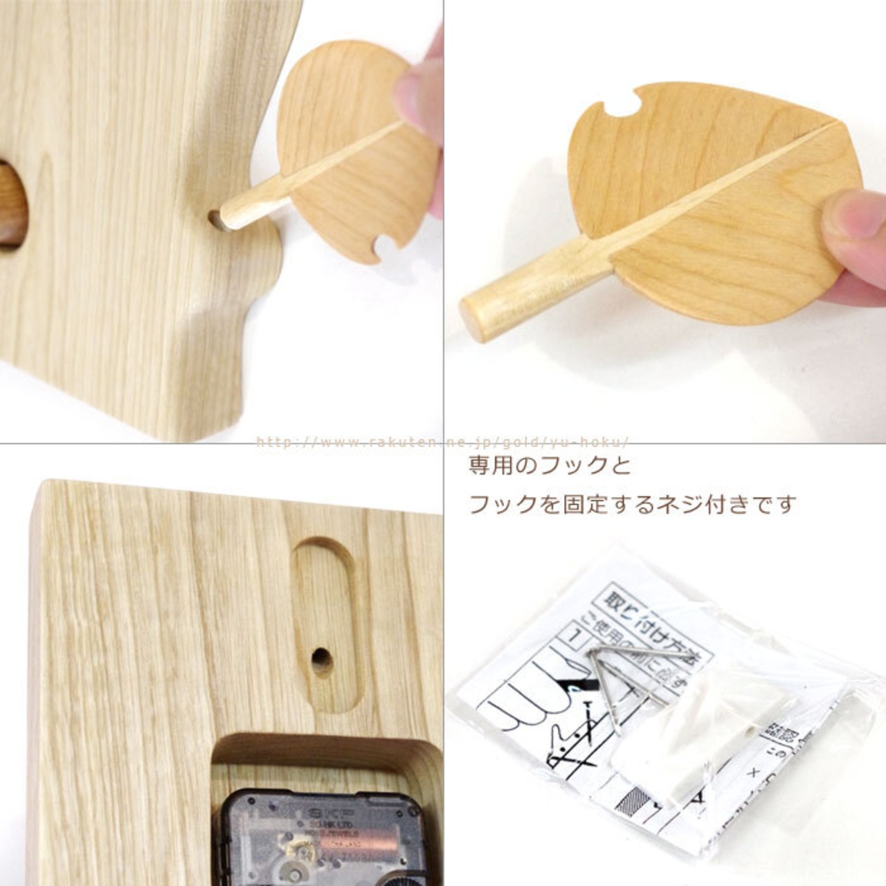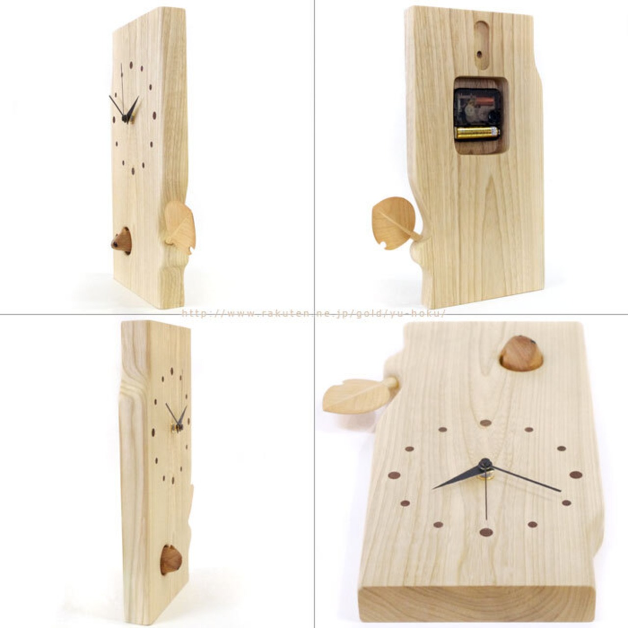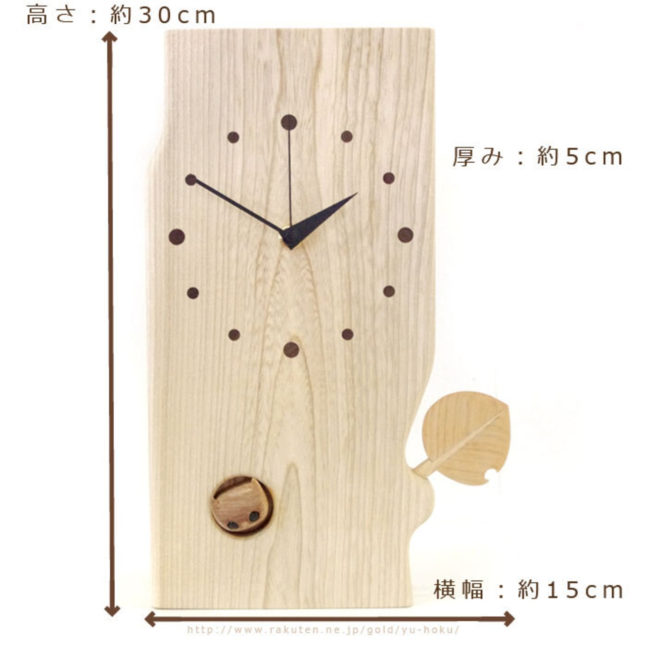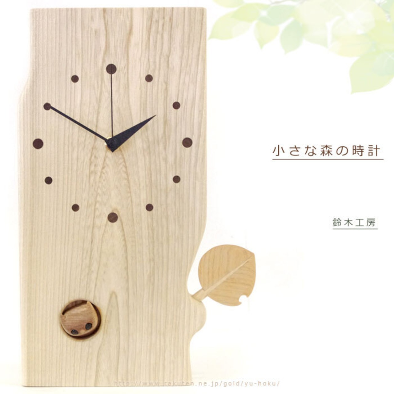 木の幹をイメージした本体に、落ち着いた雰囲気の時計、木の葉が付いており、