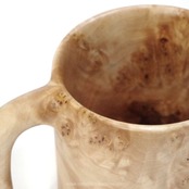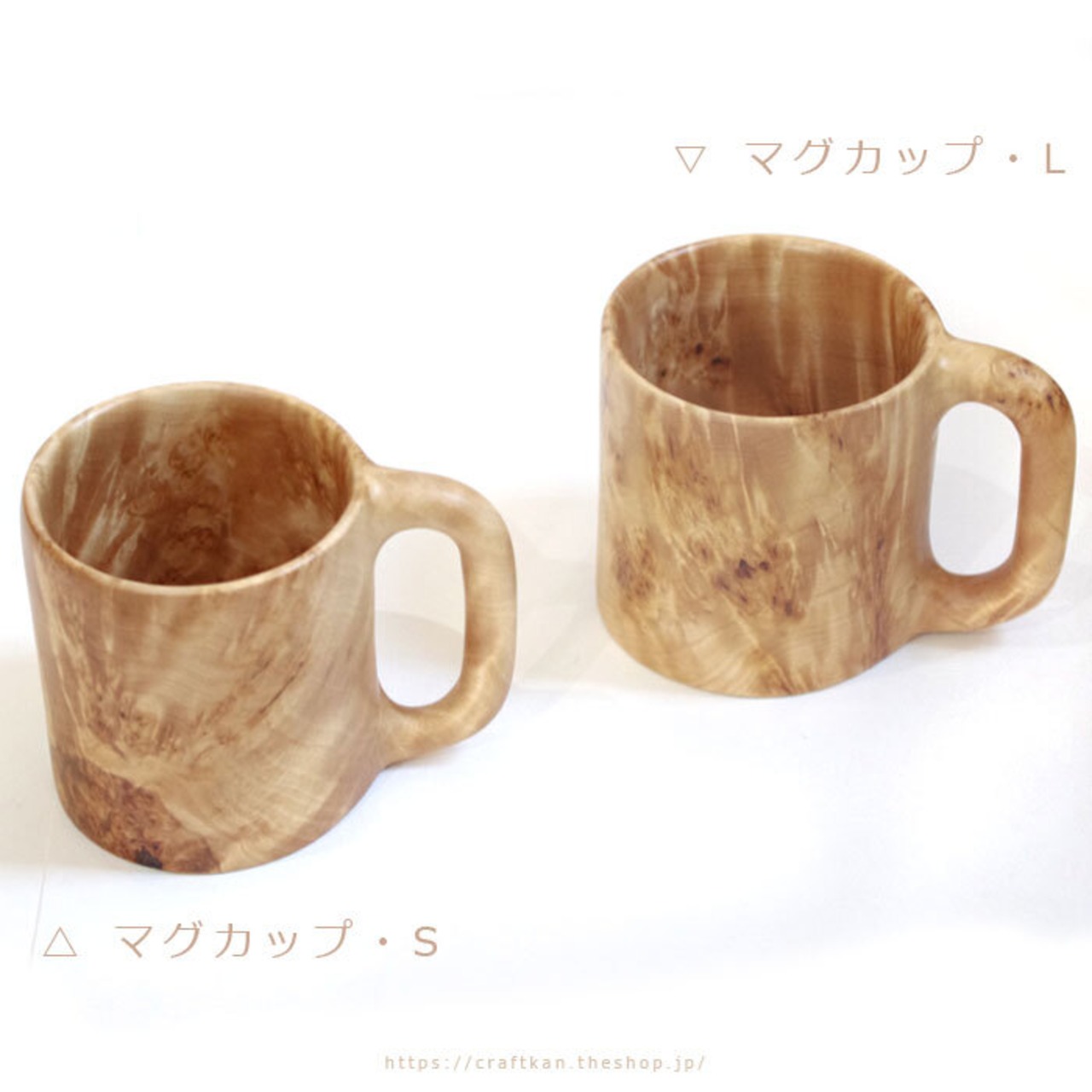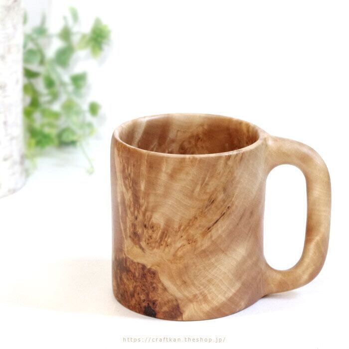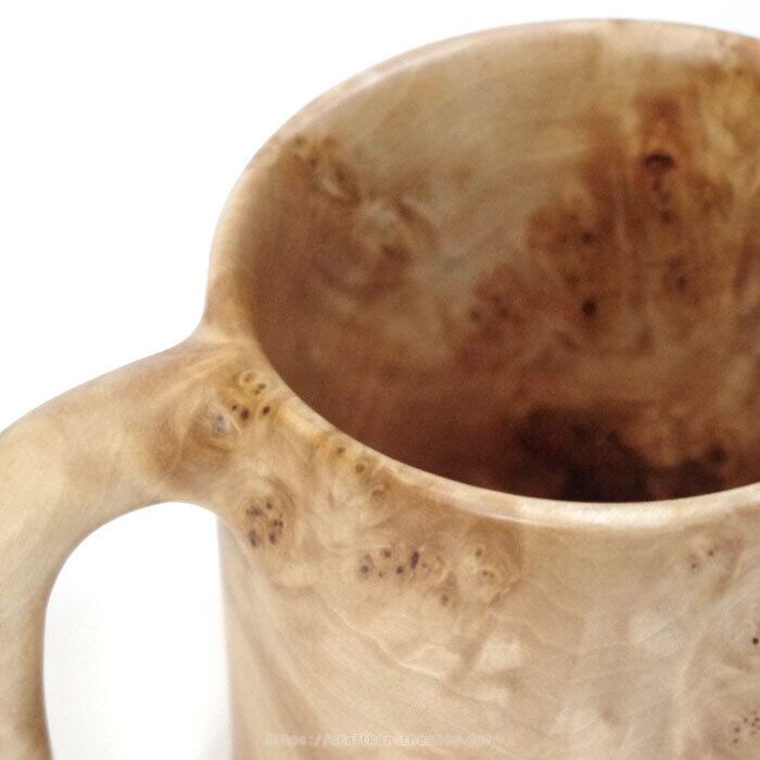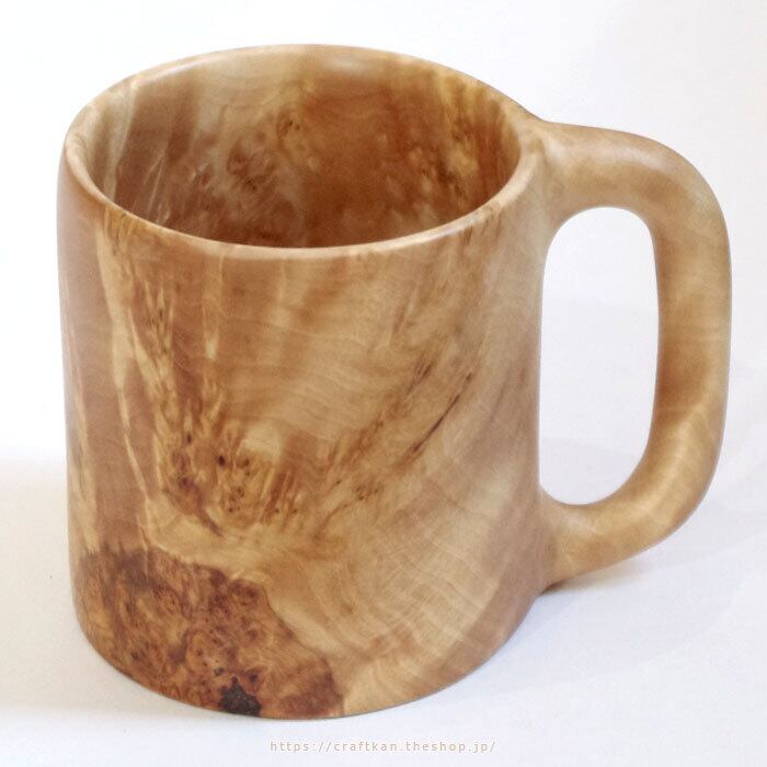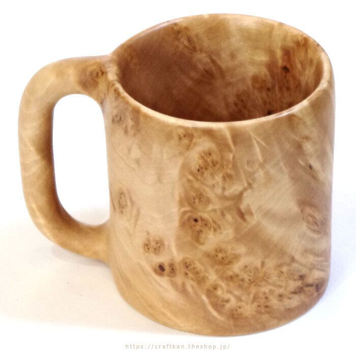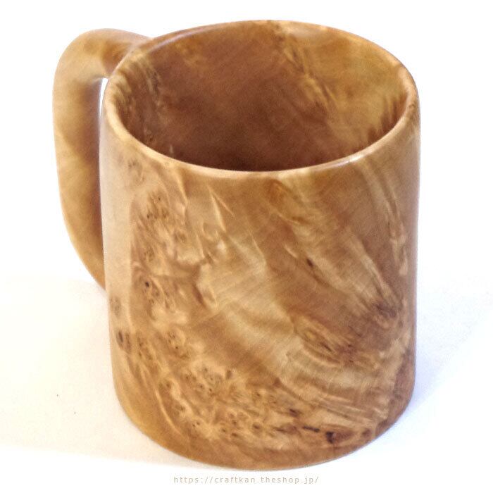 綺麗で美しい瘤(コブ)の木目がふんだんに入った木製のマグカップです。