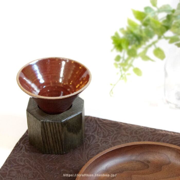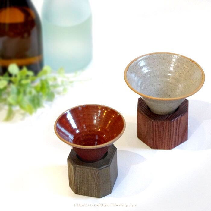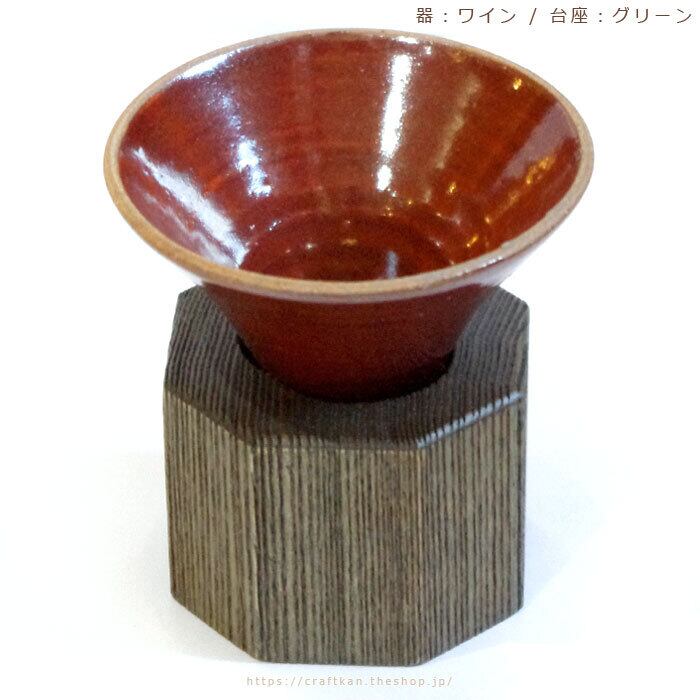 木製の台座の面の取り方やグラスを刺し込む穴の形、陶器の器や色合いは