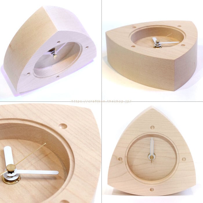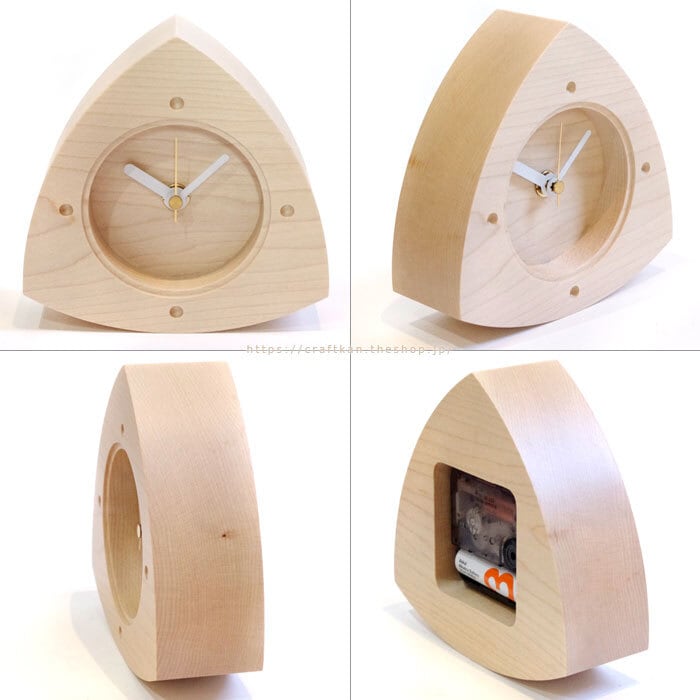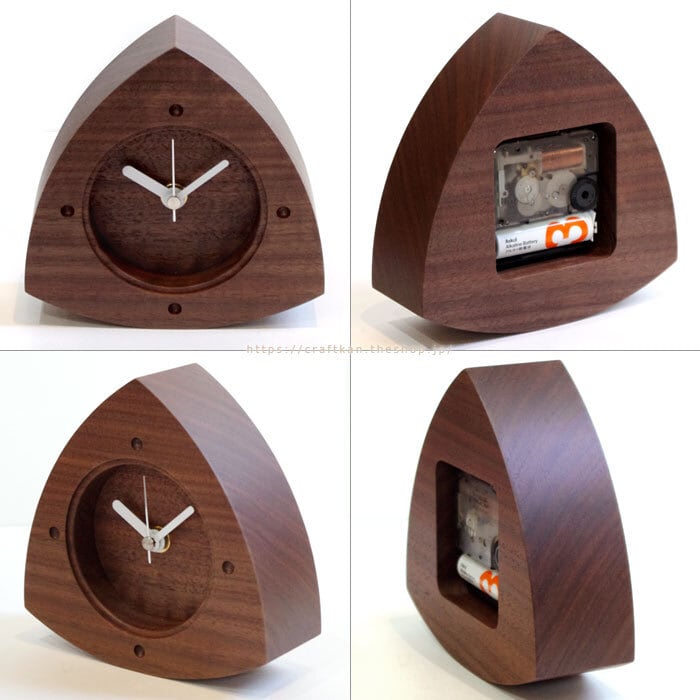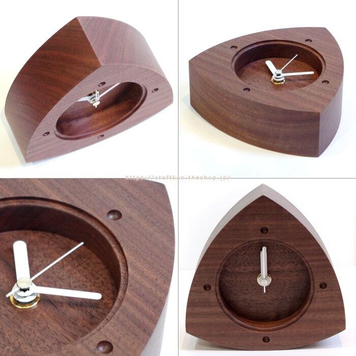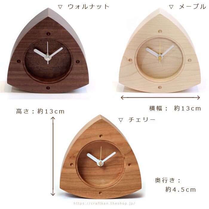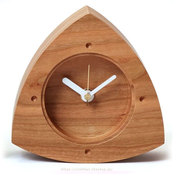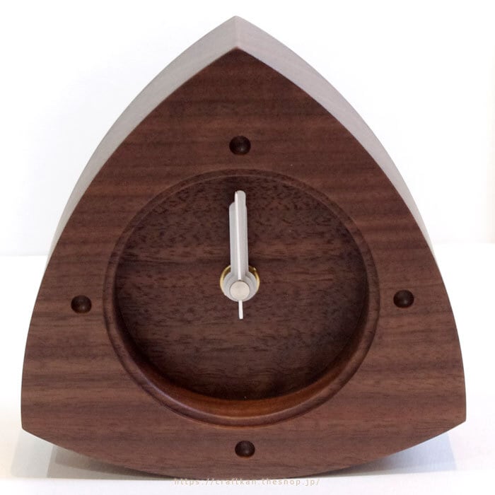秒針付き、セイコープレシジョン製スイープ式ムーブメントの木製置き時計。シンプルでおしゃれ、ころん、とかわいい、おにぎりの形をイメージした木のぬくもりのやさしい三角形の時計です