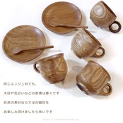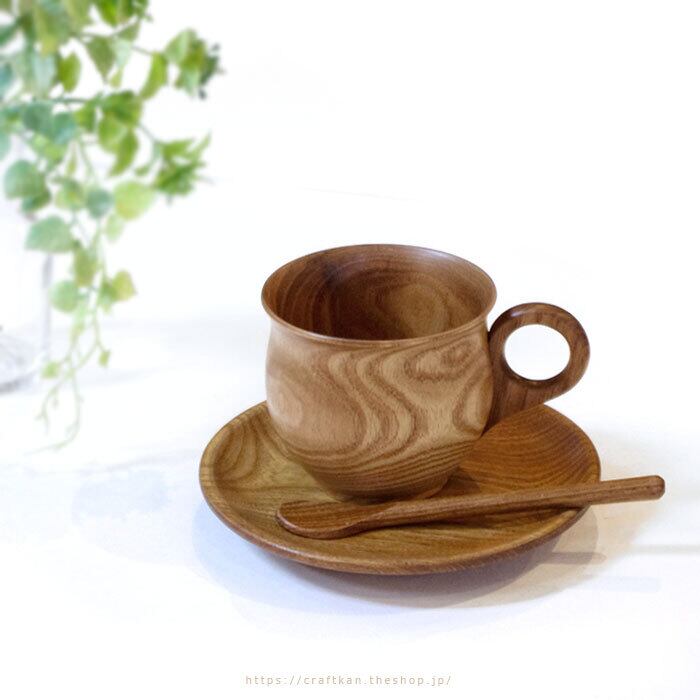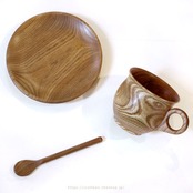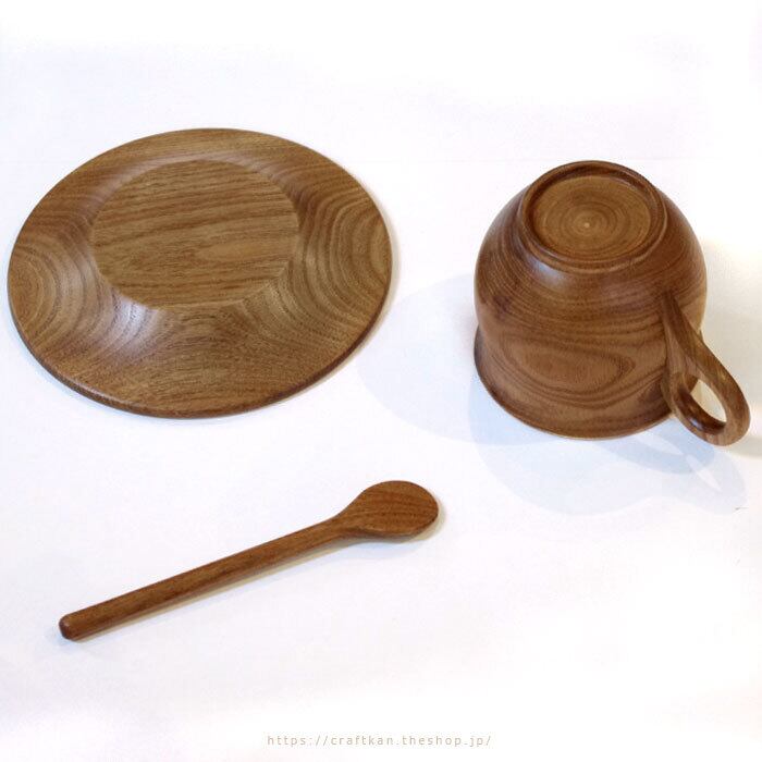 木製のコーヒーカップ、マドラー、ソーサーのセットです。
