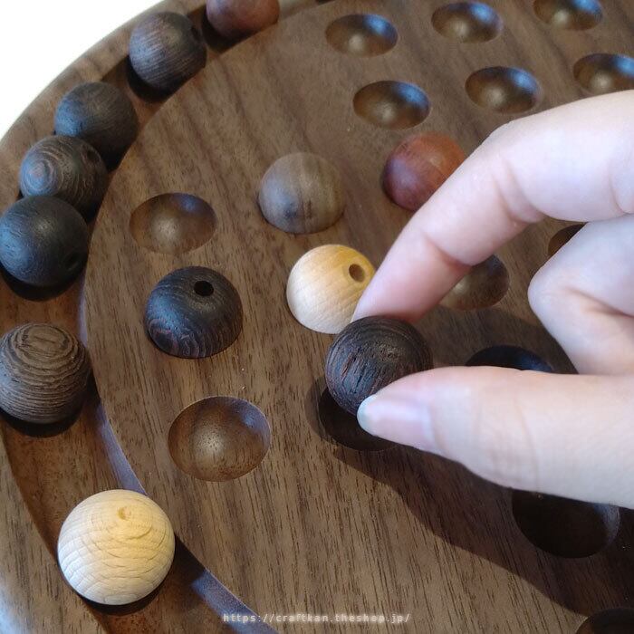 盤面も玉もすべて木で仕上げた、伝統的なボードゲームの「ソリティア」です