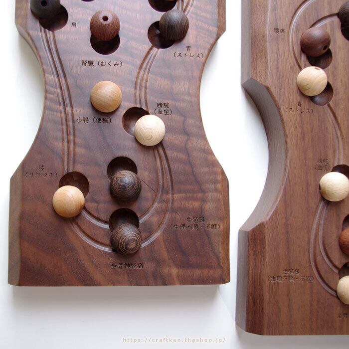レーザー彫刻で該当の箇所にそれぞれのどこのツボ、なんのツボかが記載されているので、
